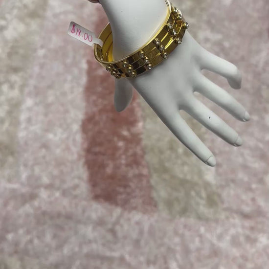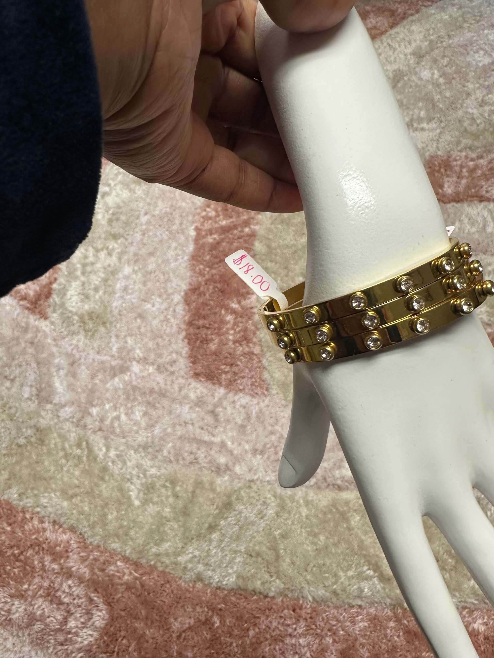 Stainless steel and 18k gold plated bangle. This bangle is water proof and tarnish resistant. It opens up for ease of use.